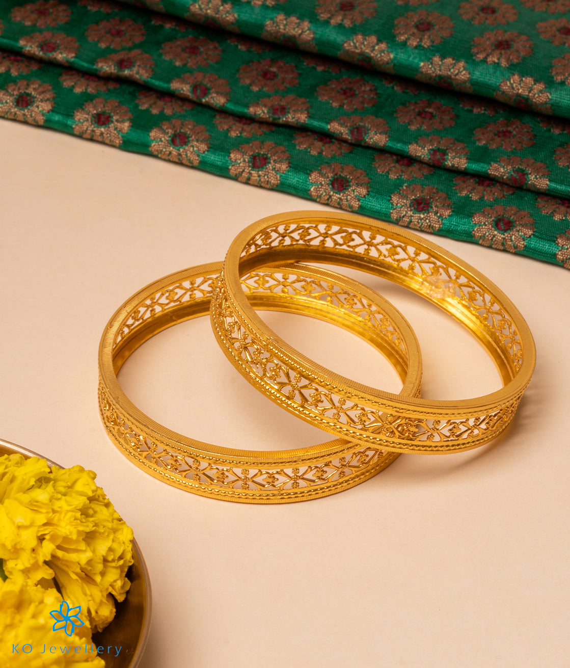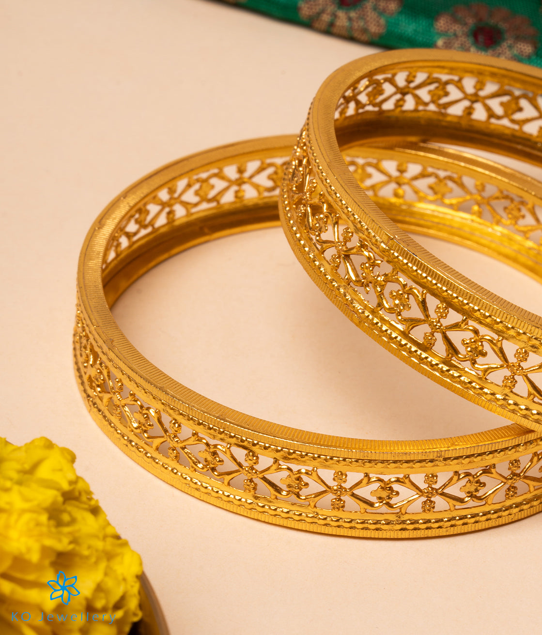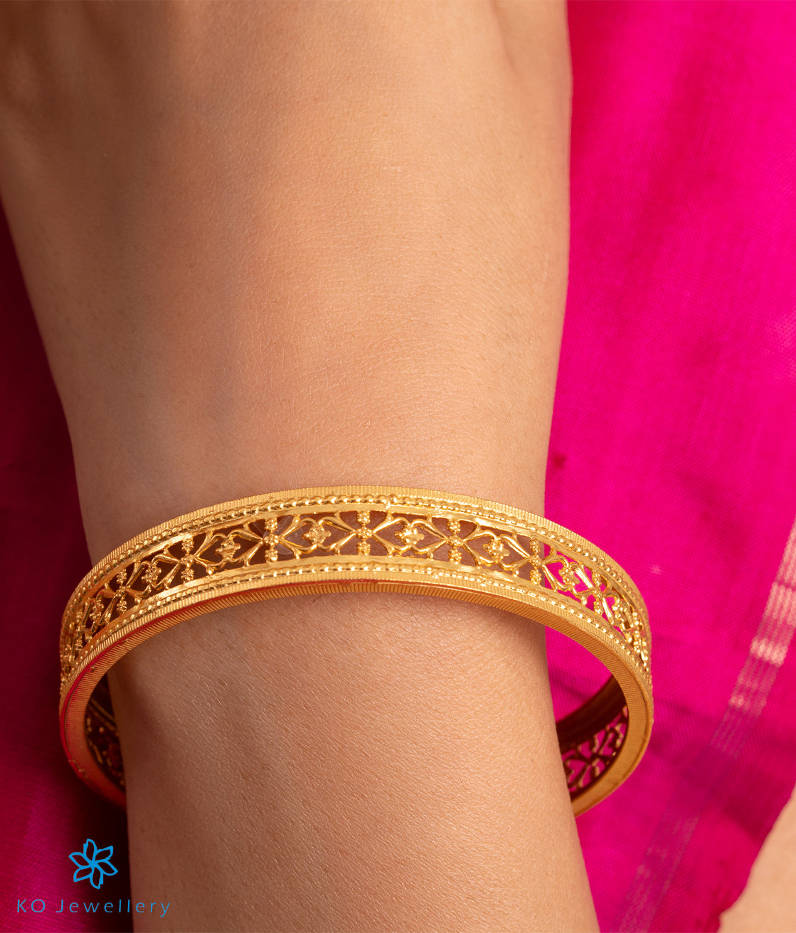 An attractive Sterling Silver (92.5%) gold-dipped, bangle handcrafted to perfection to look graceful on every hand . The ornate vine design on the bangle is extremely attractive.Buy a pair of these bangles to complement your ethnic wear this festive season. The price listed is for a single bangle.
