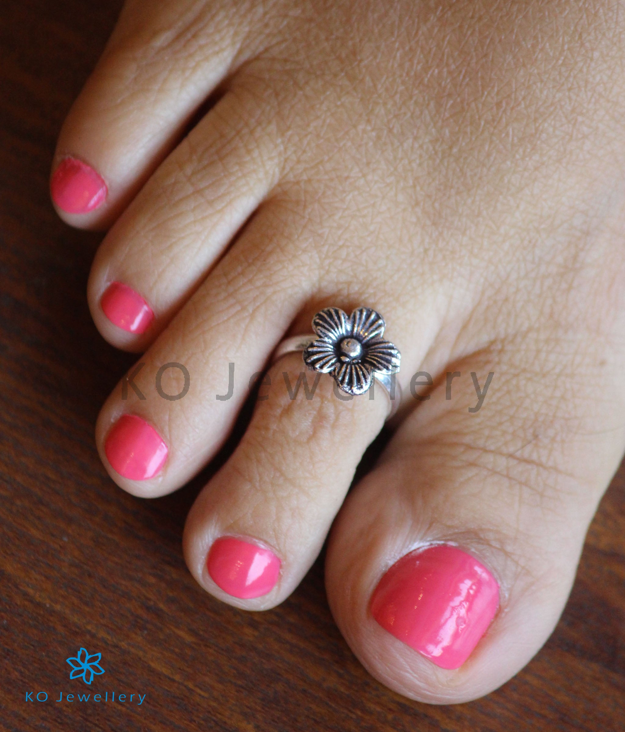 Make your feet look pretty with this cute pair of floral design Sterling silver (92.5%) toe-rings . You can adjust the open silver band at the back to fit your toe size.