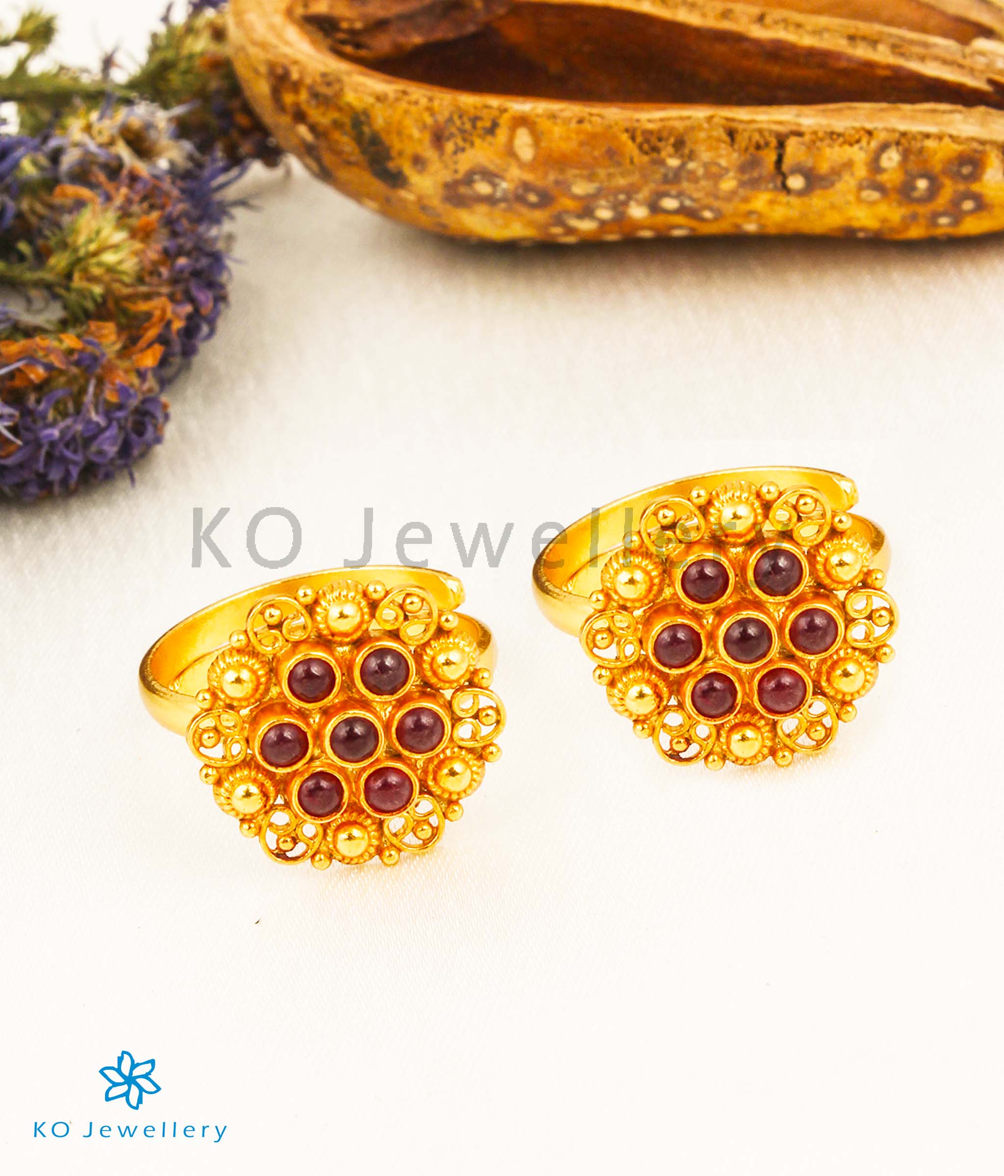A gorgeous pair of gold-dipped handcrafted sterling silver (92.5%) toe-rings with kempu stones. The intricate design at the center is decorated with kempu stones and this gives this pair an attractive look. The silver band at the back is an open one and can be adjusted according to your toe-size.