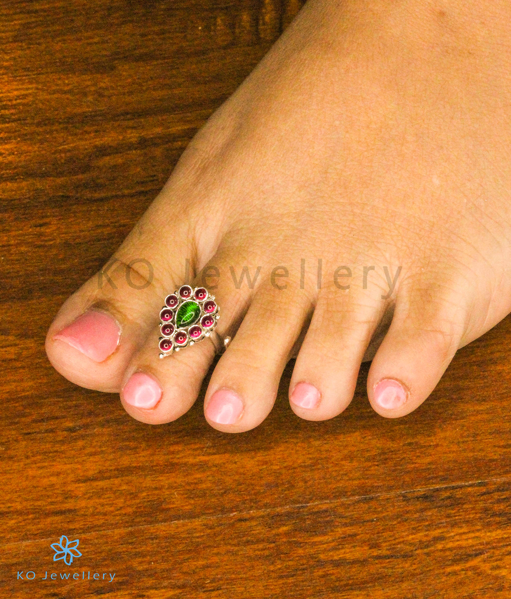 A gorgeous pair of handcrafted sterling silver (92.5%) toe-rings fit for bridal wear. The pair is decorated with kempu stones and this gives it a gorgeous look.The silver band at the back is an open one and can be adjusted according to your toe-size.