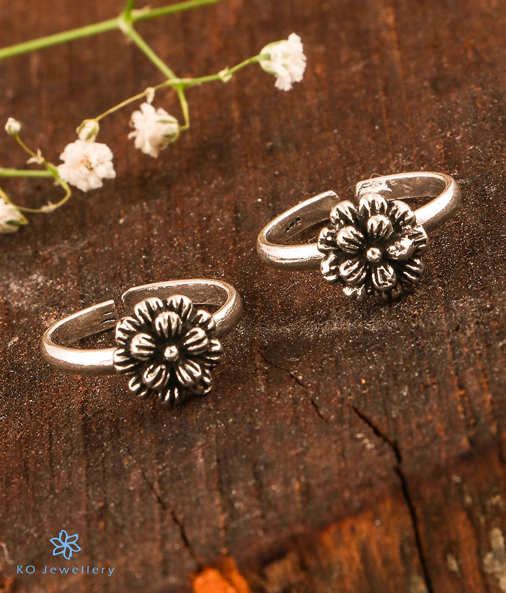 A gorgeous pair of Sterling silver (92.5%) Daffodils Silver Toe-Rings that are good for everyday wear. The silver band at the front is an open one and can be adjusted according to your toe-size.