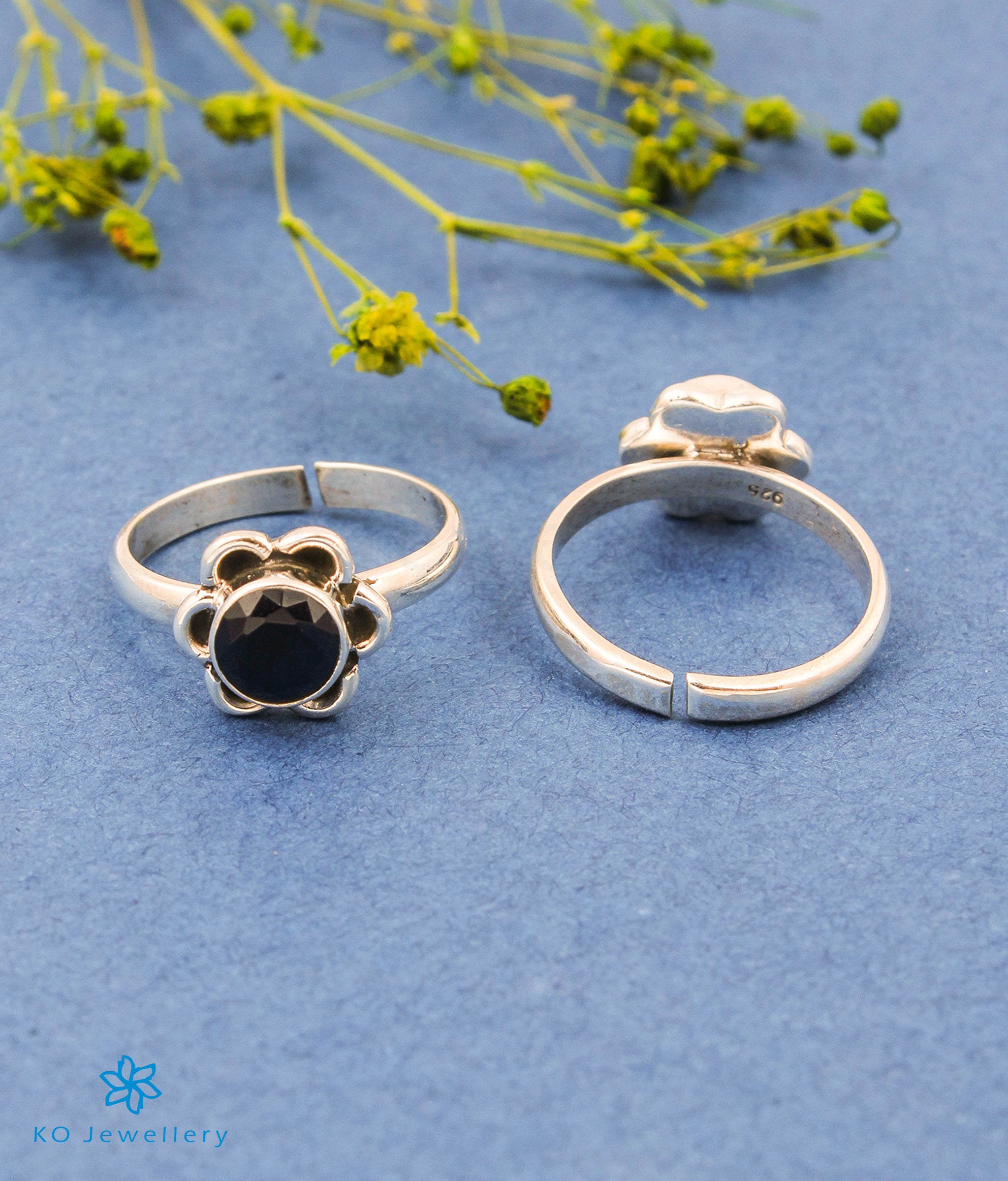 A pretty floral shape Toe-ring with dark blue Quartz, this pair of handcrafted pair in Sterling Silver (92.5%) will make for a great accessory. You can adjust the open silver band at the back to fit your toe size.