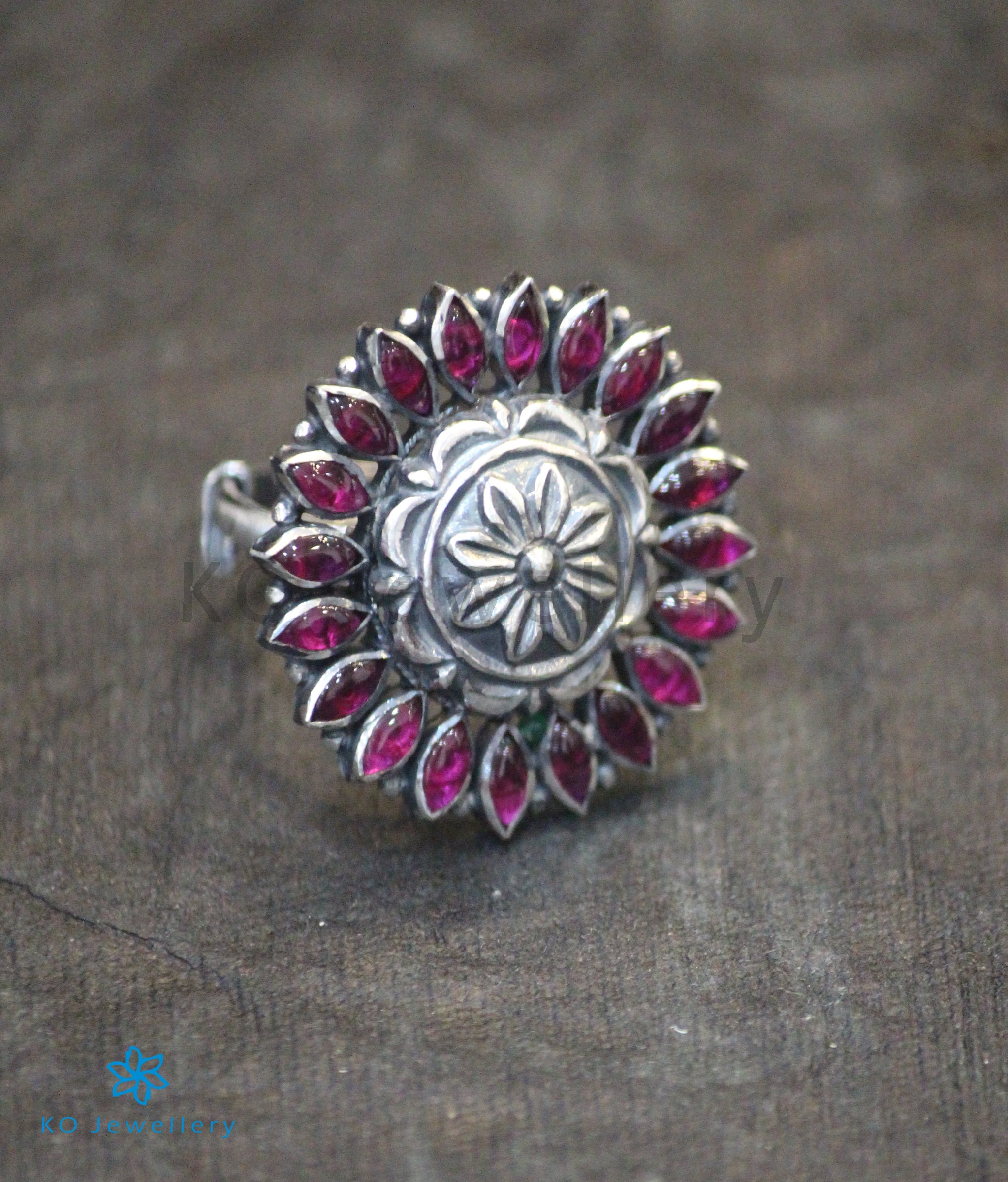 A gorgeous pair of handcrafted sterling silver (92.5%) toe-rings fit for bridal wear. The intricate design at the center is decorated with kempu stones and this gives this pair a royal look.The silver band at the back is an open one and can be adjusted according to your toe-size.