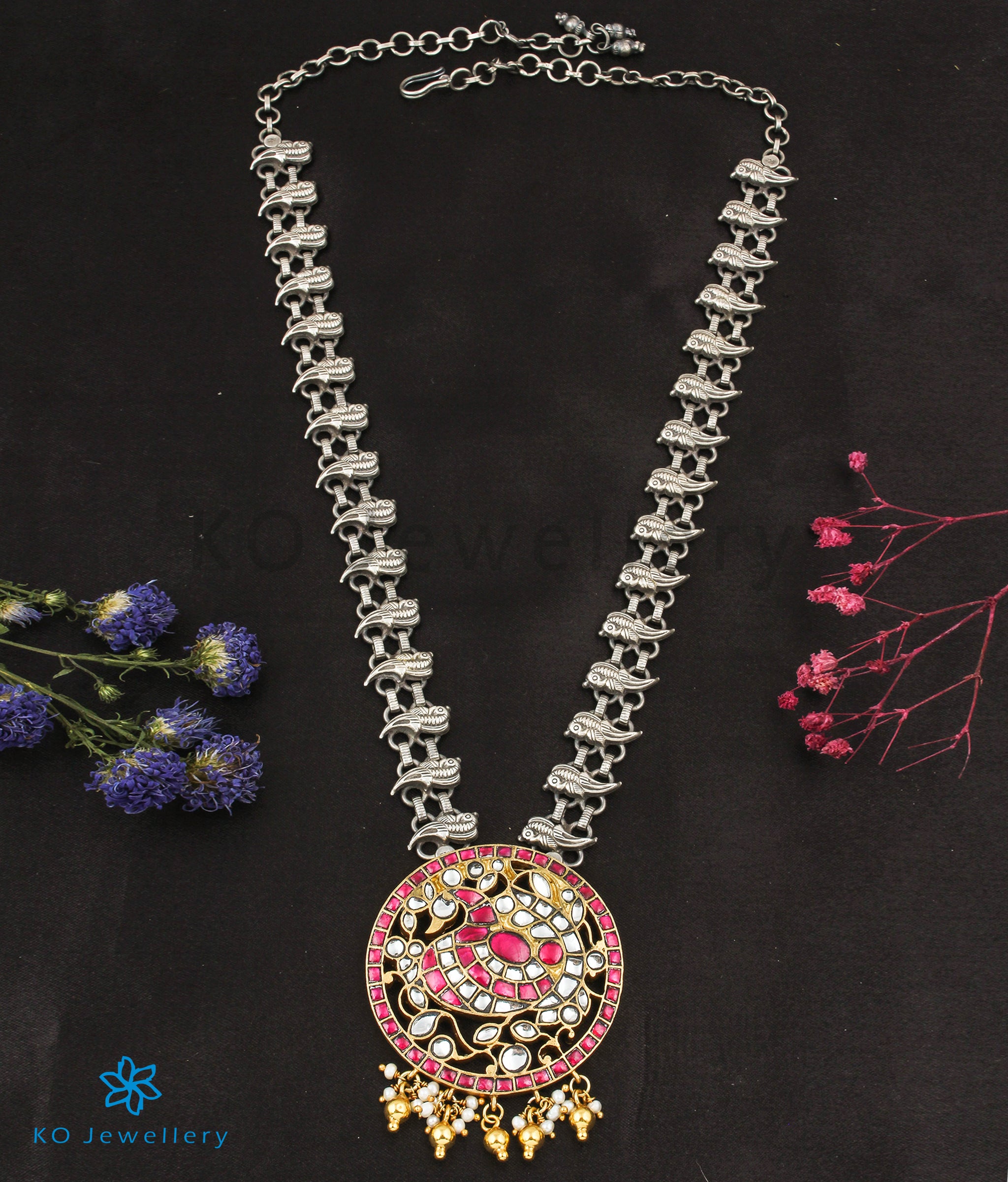 There are some pieces of jewellery that simply create a statement, this is one such piece. A gorgeous necklace with peacocks, parrots, polki stone and a subtle colour to adorn your neck! This stunning necklace handcrafted in Sterling Silver (92.5%) is accentuated with white and red kundan/polki stones. It is a truly attractive necklace that will steal all the attention.