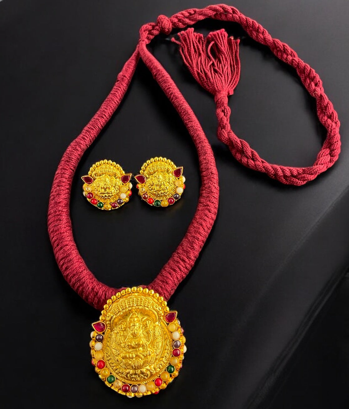 Adorn yourself with a stunning symbol of divine abundance – this handcrafted 925 Silver Thread Necklace & Earrings with 24 K gold plating, features the Goddess Lakshmi Motif. Meticulously handcrafted by skilled artisans, this exquisite design captures the serene beauty of Goddess Lakshmi sitting gracefully on a blooming lotus.