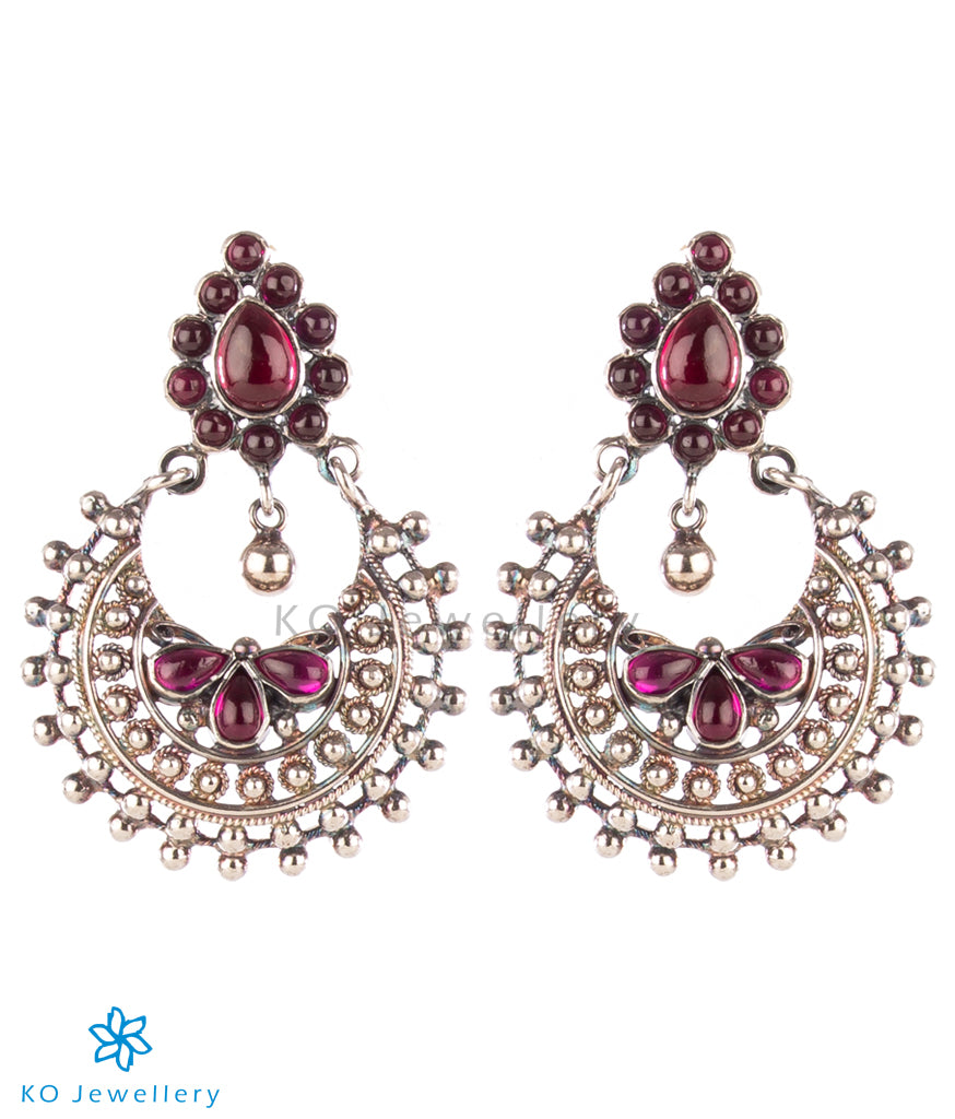 A gorgeous pair of Sterling Silver (92.5%) earrings in the chand-bali style, with a kempu stone ear-stud. Crafted using techniques used in ancient South Indian antique gold temple jewellery the entire piece is crafted in silver and oxidised to give a dark patina.