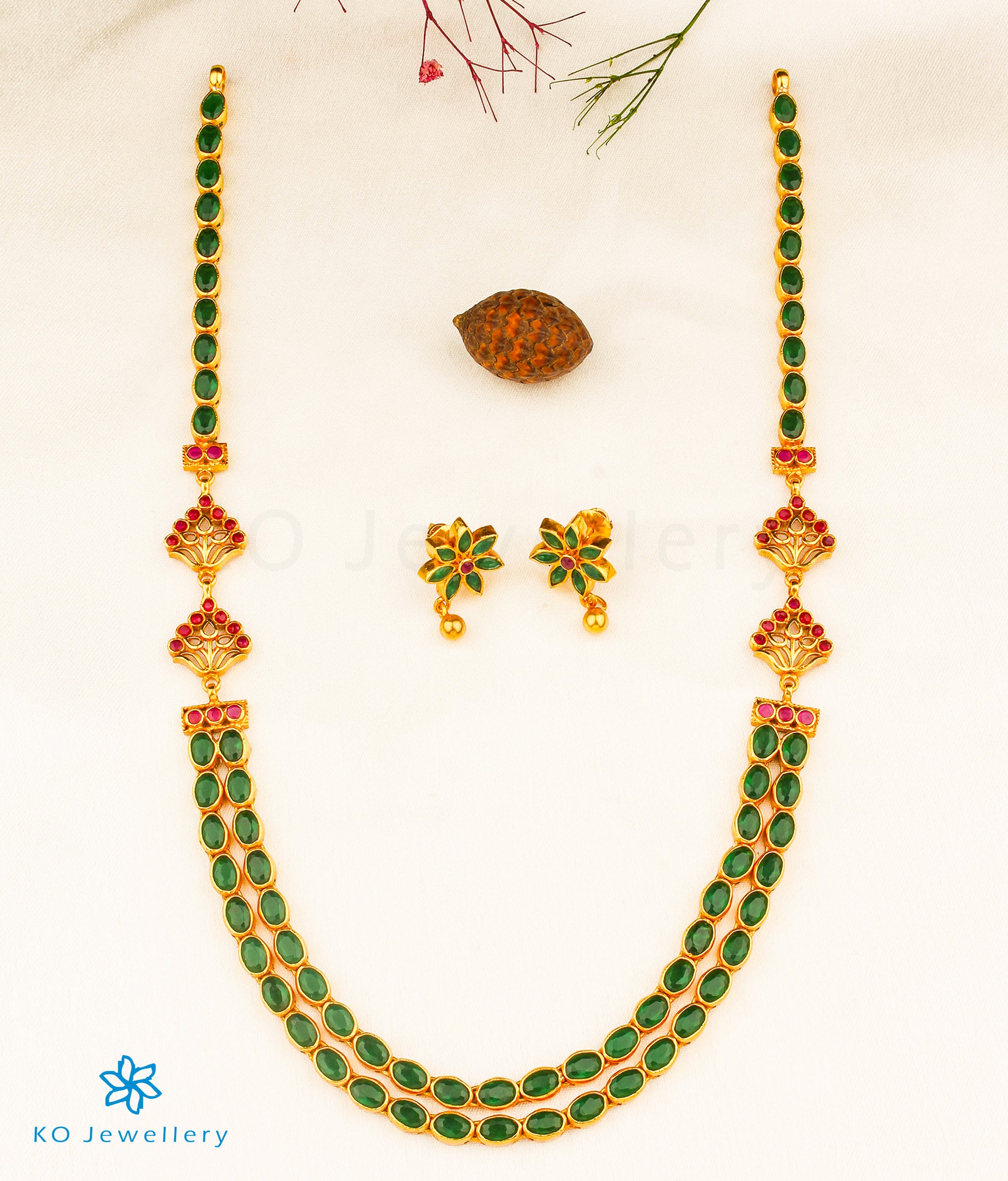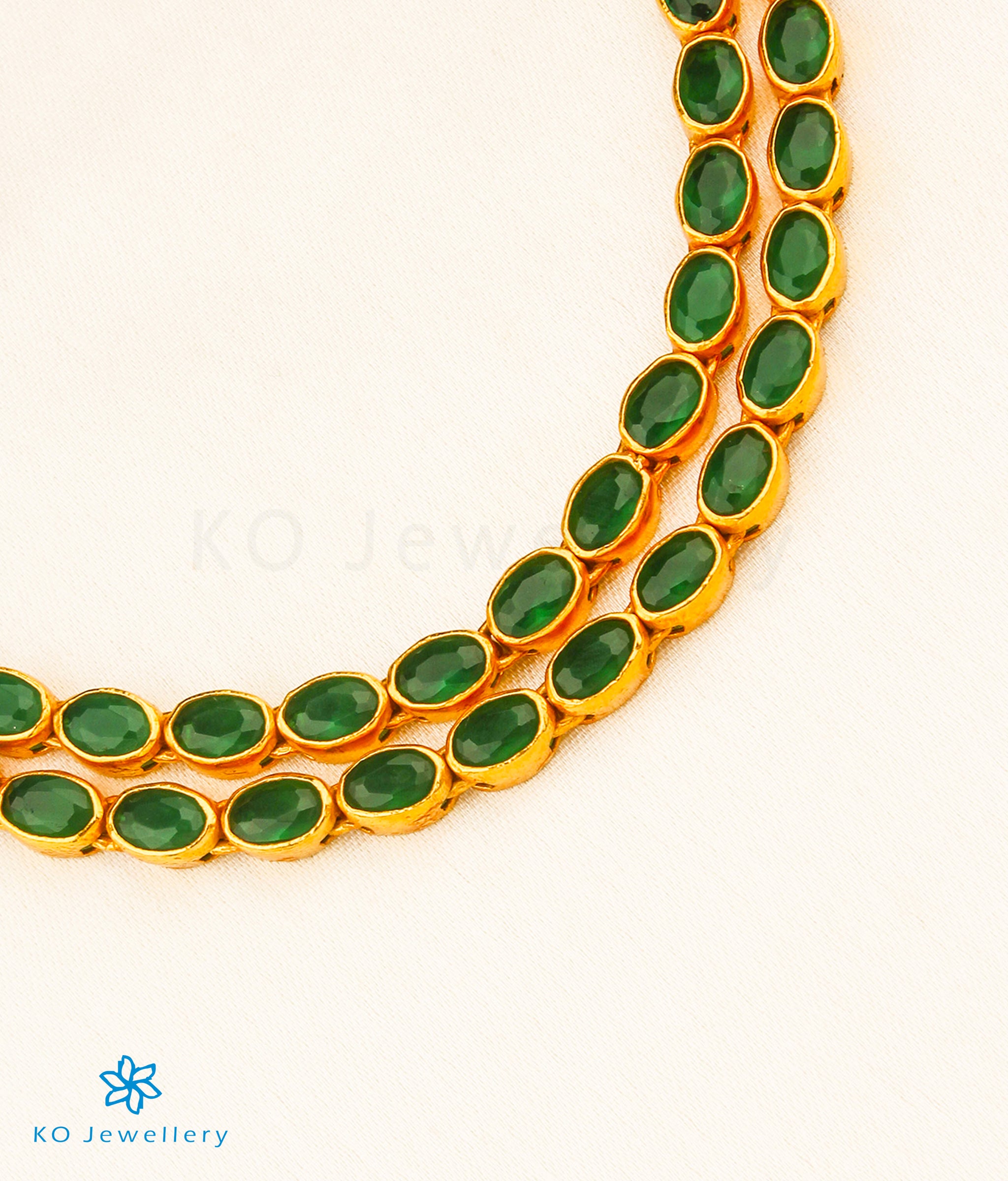 The bright green colour of this gorgeous two-layered kempu stone necklace is irresistable. Handcrafted in Sterling Silver (92.5%) this piece as been gold-dipped to perfection.
