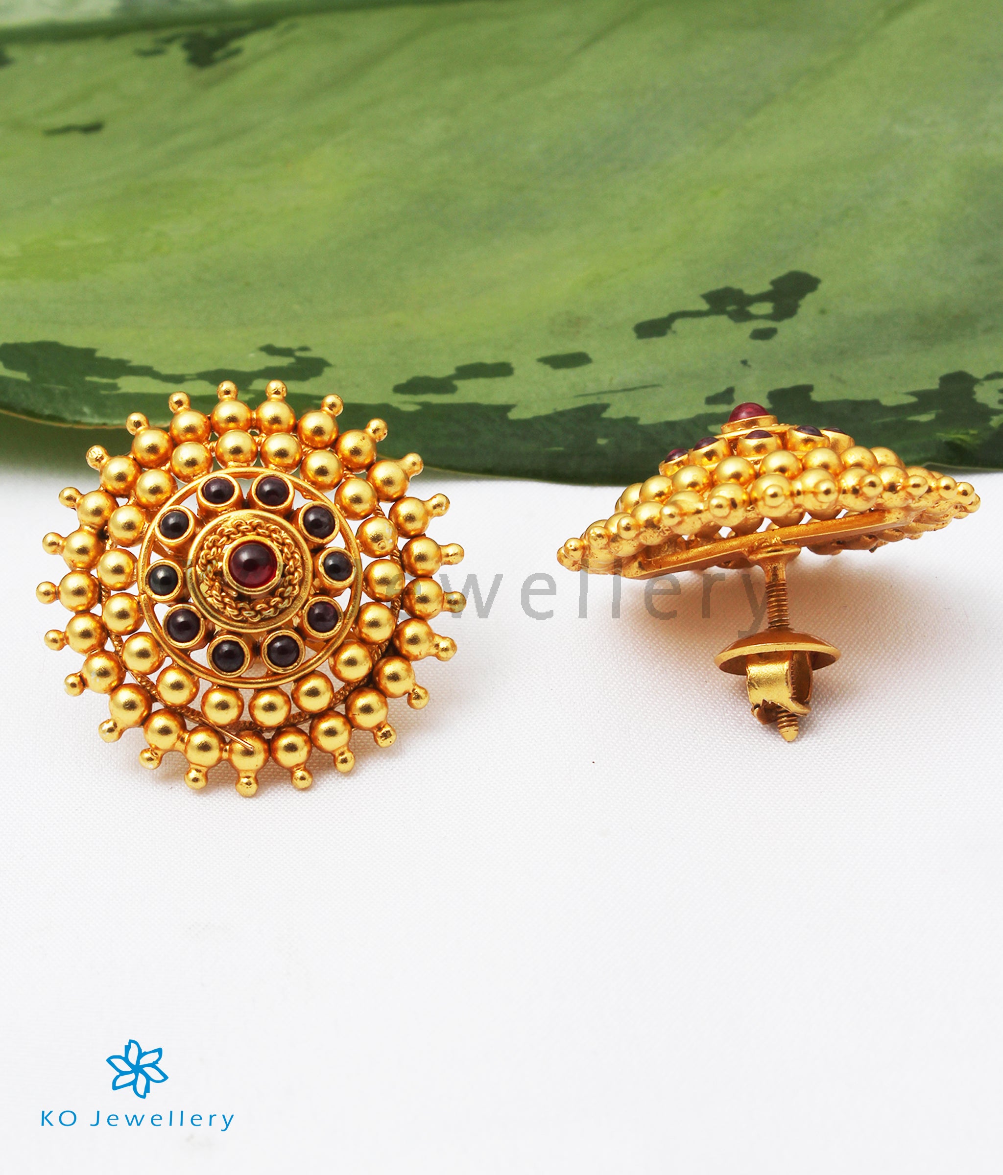 Stunning and gorgeous in design, this is an impeccably handcrafted pair of kempu earstuds in Sterling Silver (92.5%) which has been gold-dipped. It comes with screw-back or bombay screw closure.