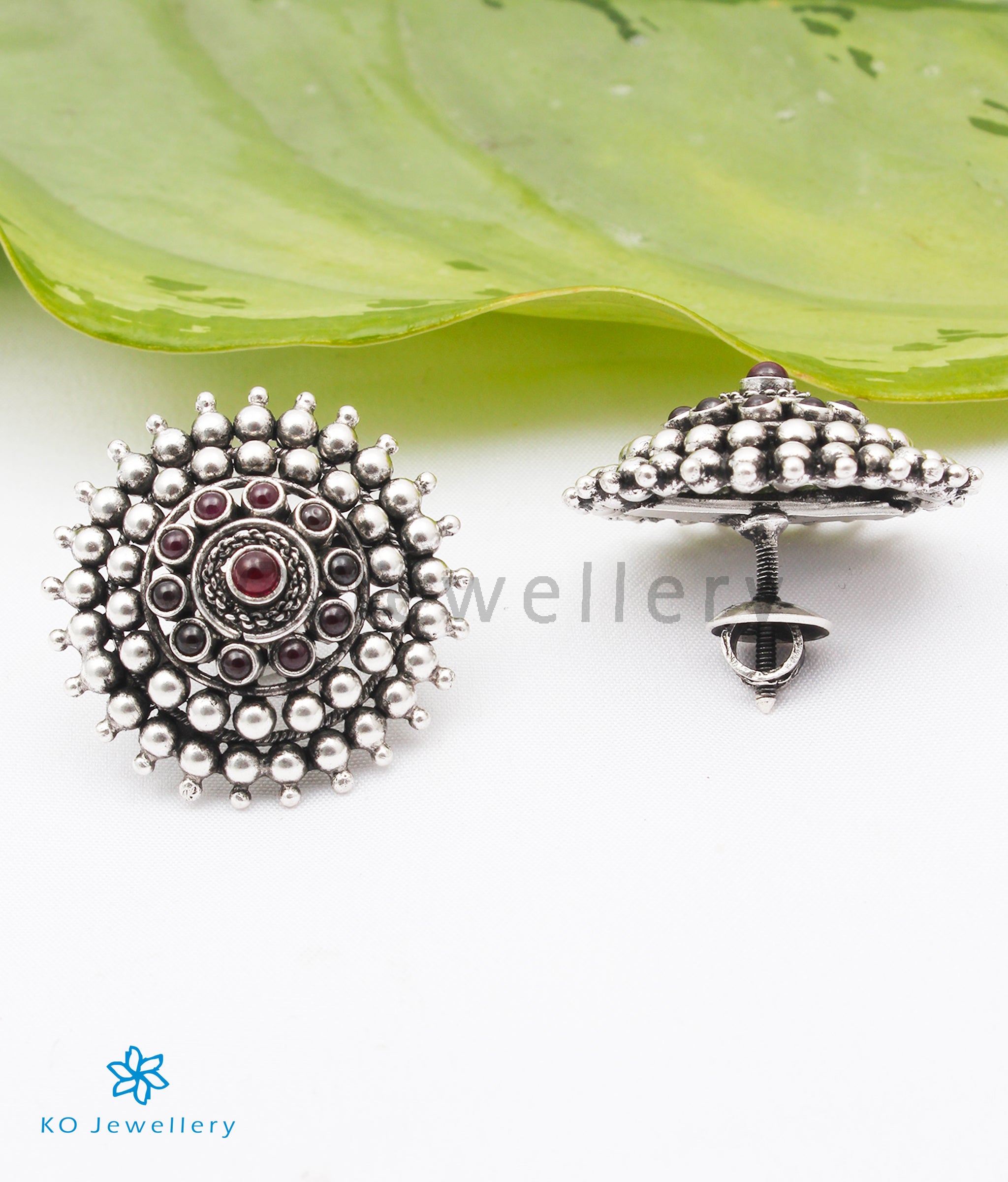 Stunning and gorgeous in design, this is an impeccably handcrafted pair of kempu earstuds in Sterling Silver (92.5%) which has been oxidised. It comes with screw-back or bombay screw closure.
