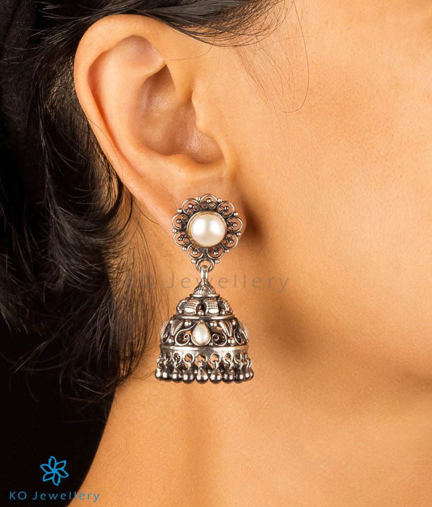 The Aditri Silver Pearl Jhumka - Buy authentic, latest design temple jewellery jhumkas in Sterling Silver - KO Jewellery