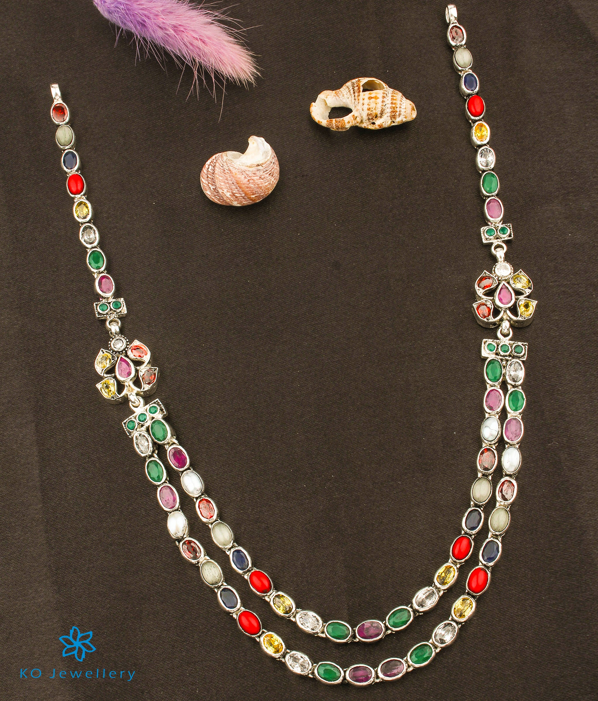 Look stunning in this lovely two layered necklace studded with navratna gemstones .The elaborate design is combined with flawless craftsmanship to make it a stunning piece. All pieces in this collection are crafted in Sterling (92.5) Silver and oxidised in a special process to give them an antique look.