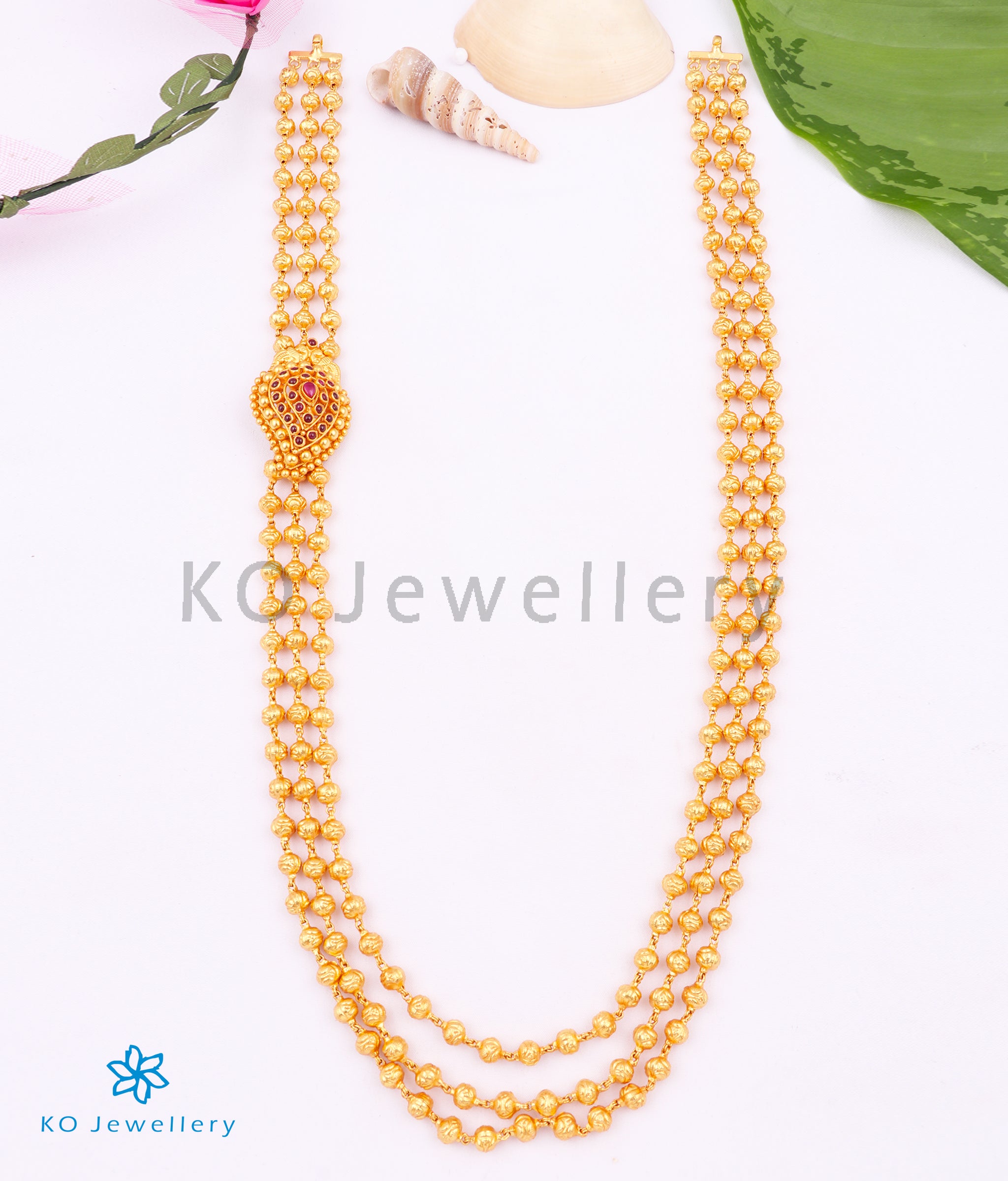 A classic and traditional design, this ornate and lengthy necklace in three layers is truly a head-turner.The necklace is made up of gold-dipped, Sterling Silver (92.5%) beads called Mohanmale which is a traditional centuries old ornament worn by women in south India.The beads have a unique floral design and are handwoven in silver wire and dipped in 24 karat gold. The 3 layers of the necklace are held together by a mango or paisley shaped pendant on one side.