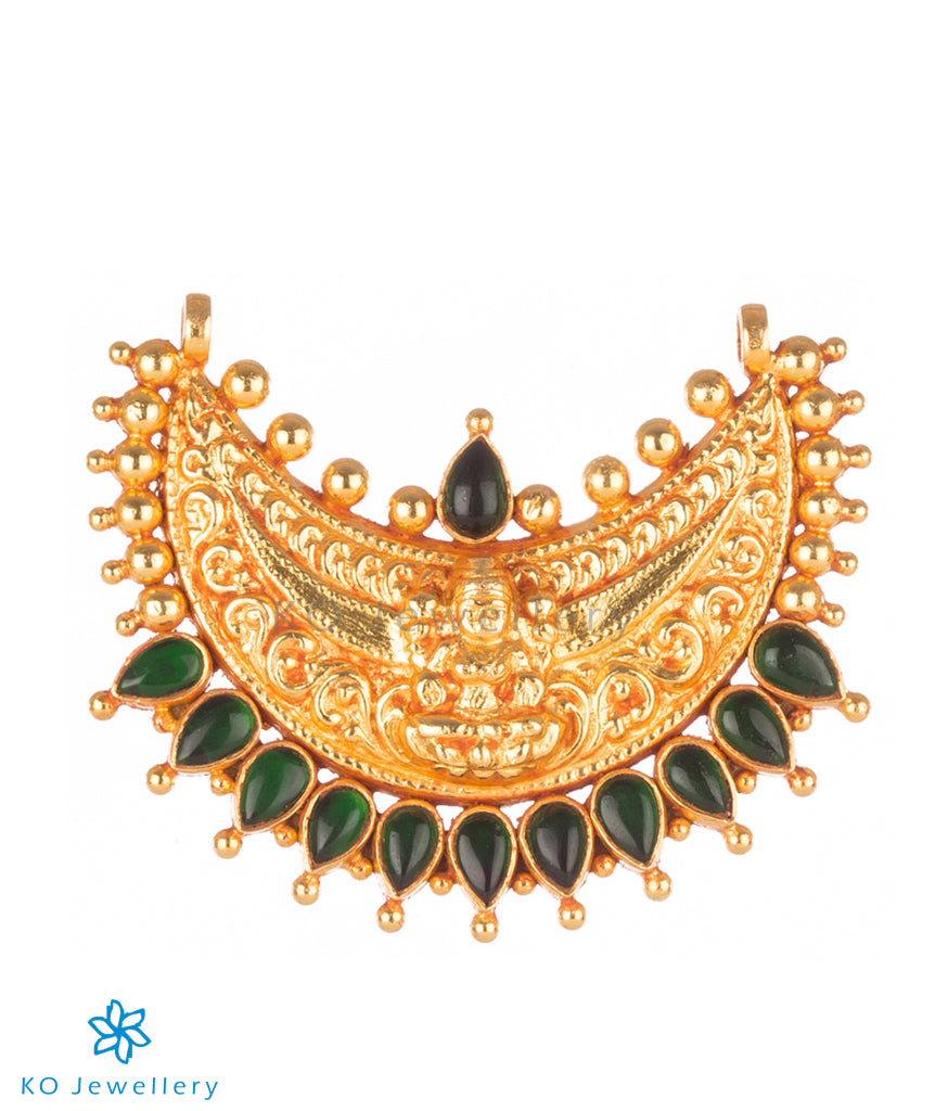 The pendant on this long necklace has the image of Goddess Laxmi on it and the green kemp stones give it a lovely dash of colour.