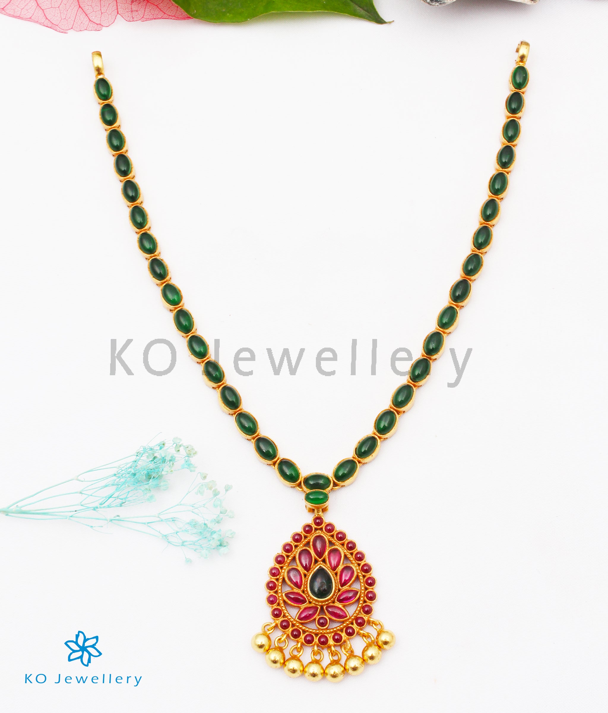 This beautiful necklace crafted out of kempu-stones showcases an interesting colour-combination of red and green.Crafted using techniques used in ancient South Indian antique gold temple jewellery the entire piece is crafted in pure Sterling Silver (92.5%) and dipped in 24 karat gold.