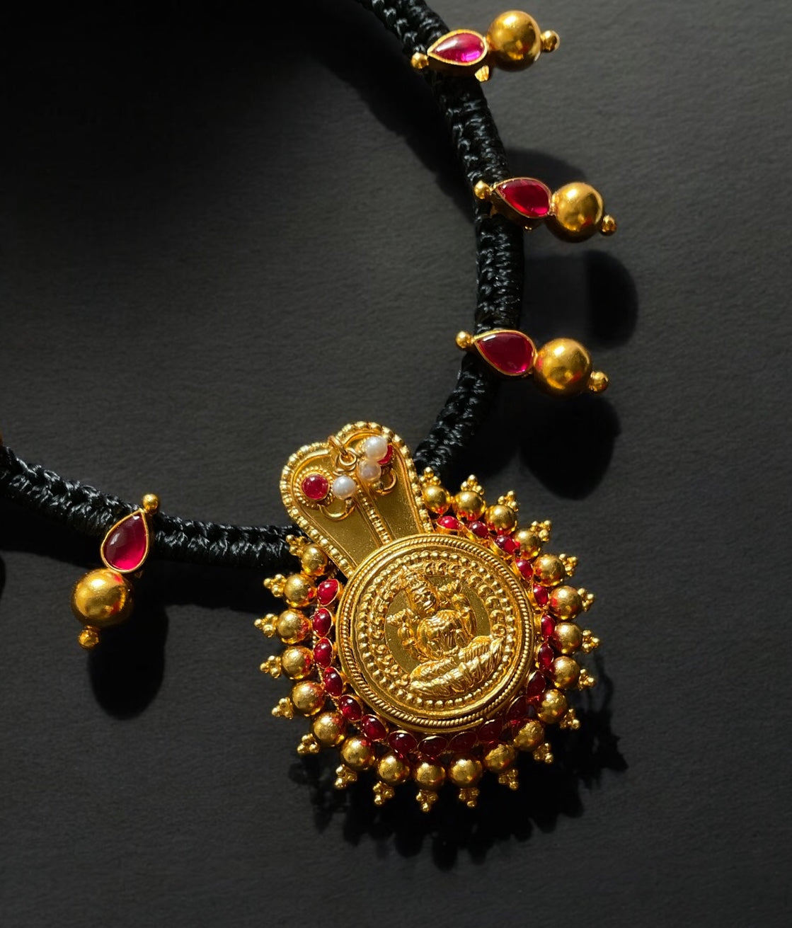 The pendant has a traditional round shape surmounted with a stylized cobra hood, set with tiny rubies for the eyes and the image of goddess Lakshmi at the center.