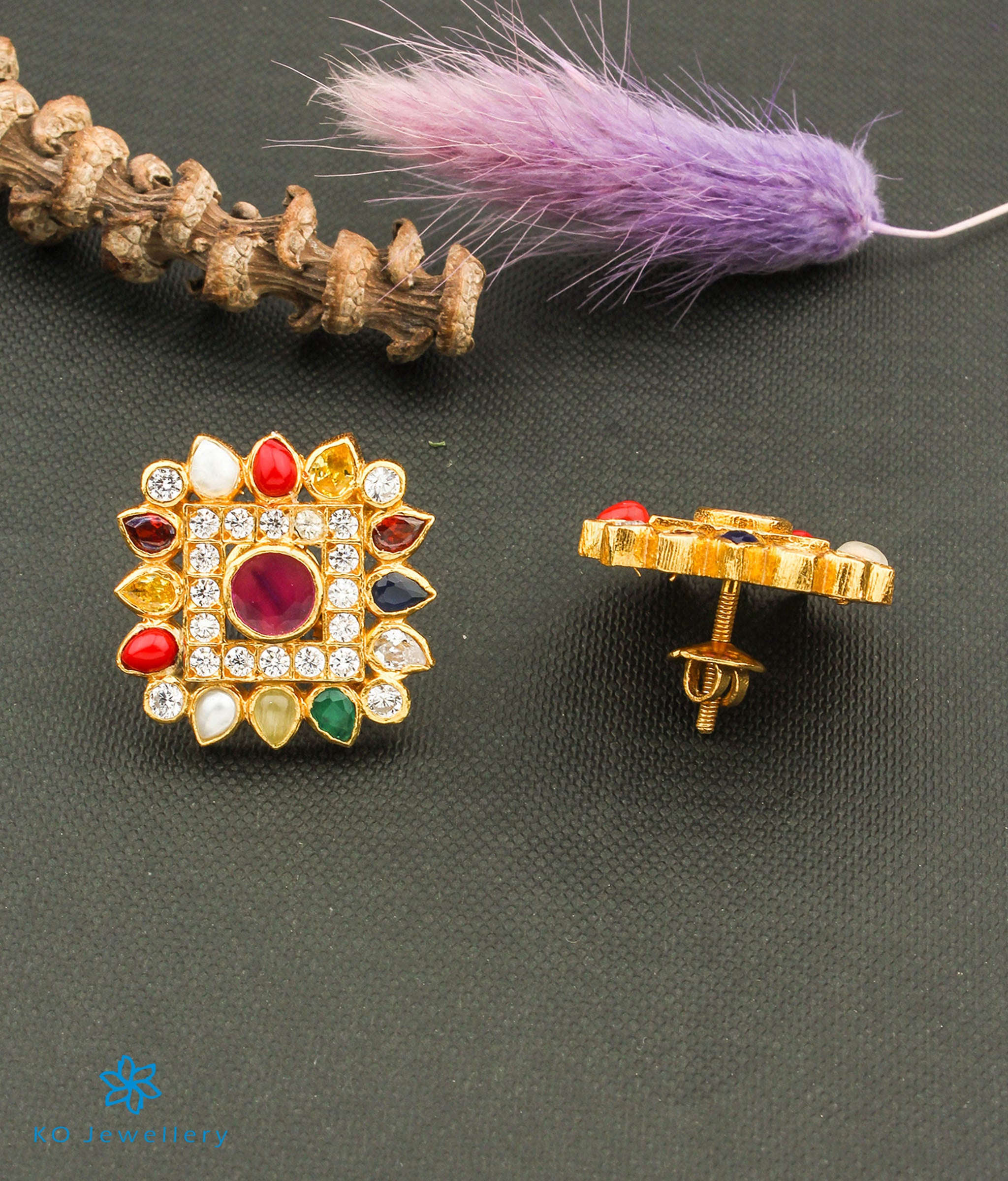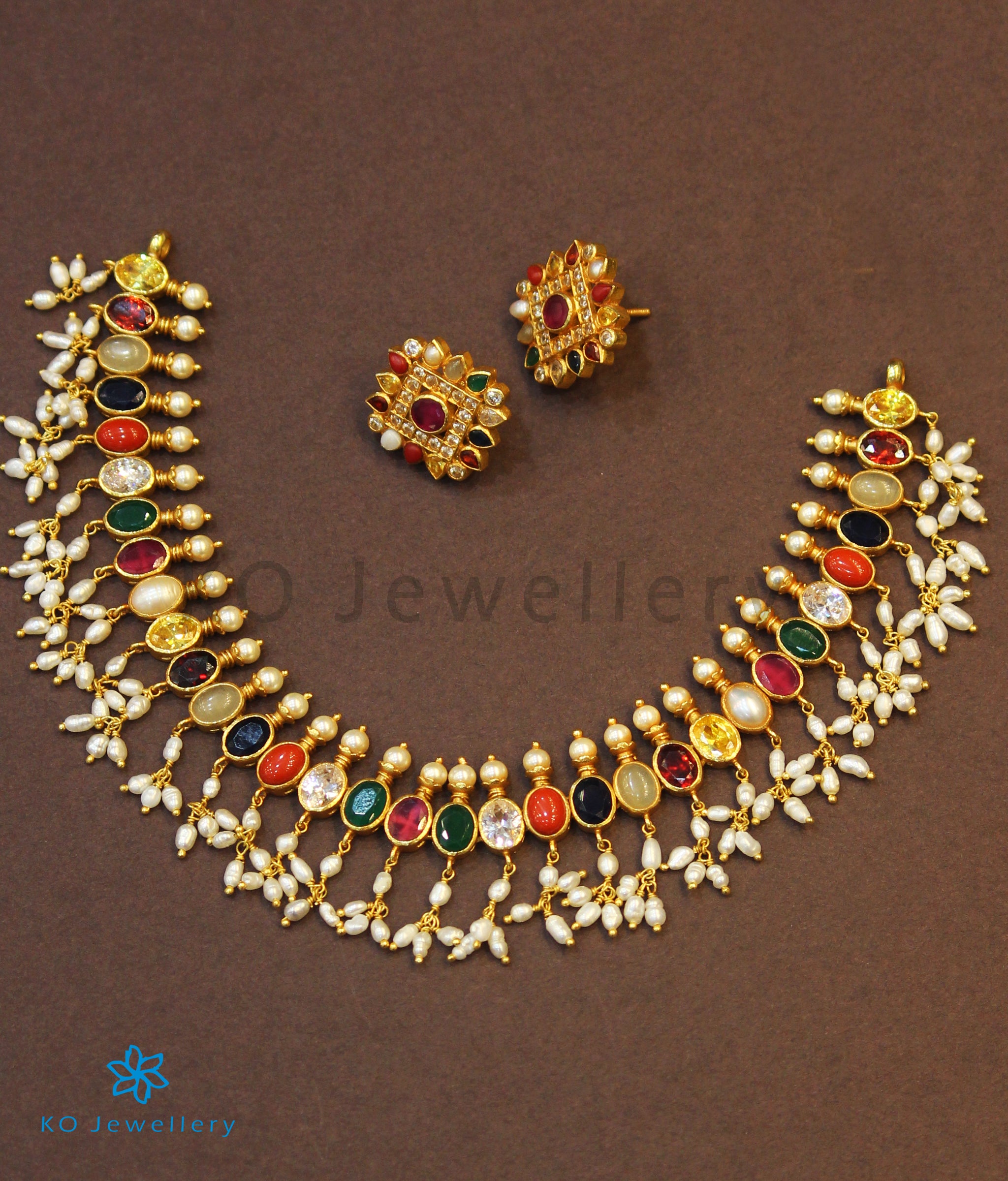 Catch everyone's attention with this beautiful Sterling Silver (92.5%) navratna or nine-gems necklace which will match any oufit.Crafted using techniques used in ancient South Indian antique gold temple jewellery the entire piece is crafted in pure silver and dipped in 24 karat gold.