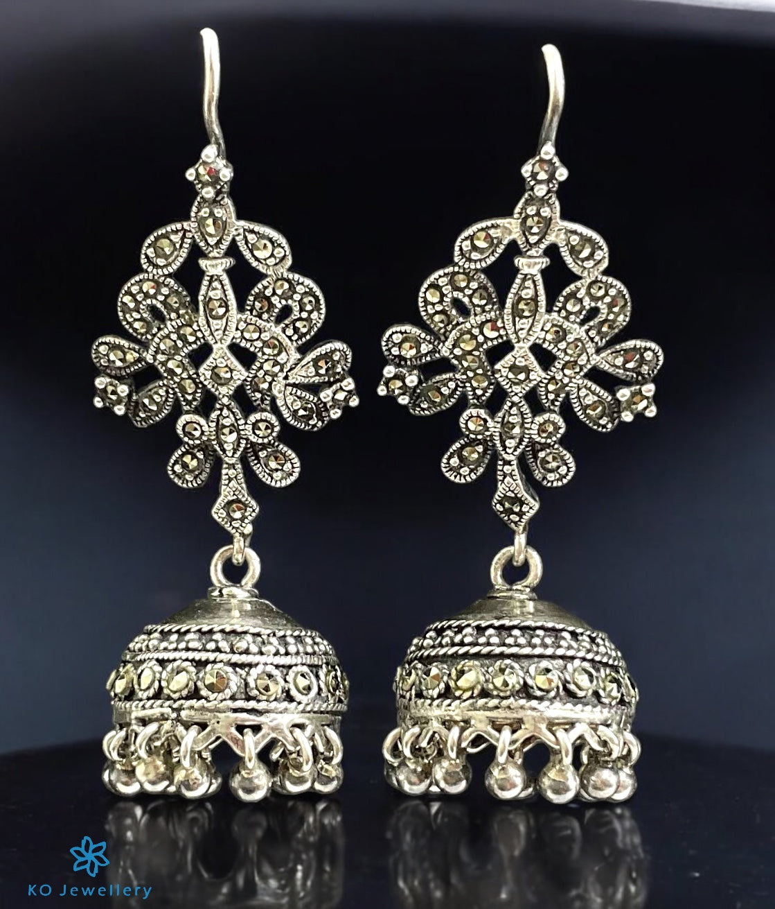 Stylish and trendy best-sellers our handmade Sterling Silver (92.5%) jhumkas, featuring dazzling Swiss marcasite gemstones are a statement of style and sophistication. Crafted from high quality 92.5% pure sterling silver for a lustrous, durable finish that shines with every movement.