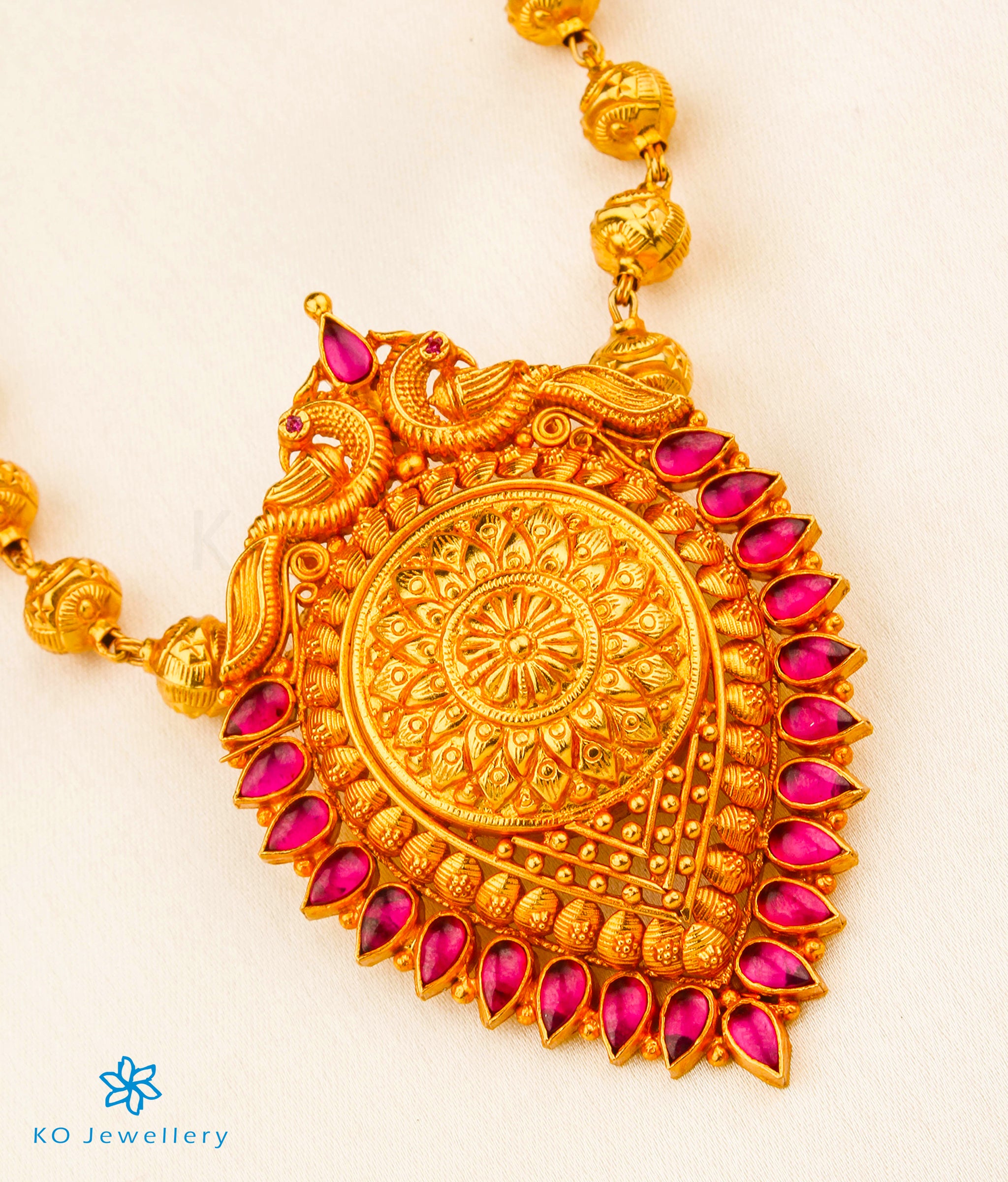 A gorgeous necklace with a ornate pendant in a traditional design. Handcrafted in Sterling Silver (92.5%) using techniques from ancient South Indian antique jewellery this piece is studded with kempu stones. The necklace string is made up of mohanmale beads handwoven in silver wire that is gold-dipped.
