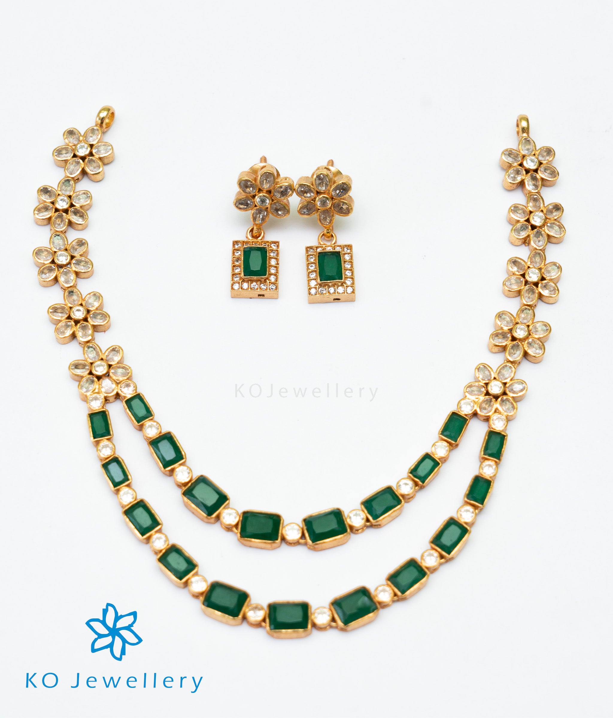 Catch everyone's attention with this beautiful Sterling Silver (92.5%) necklace in two layers with green colour stones which will match any oufit.Crafted using techniques used in ancient South Indian antique gold temple jewellery the entire piece is crafted in pure silver and dipped in 24 karat gold.