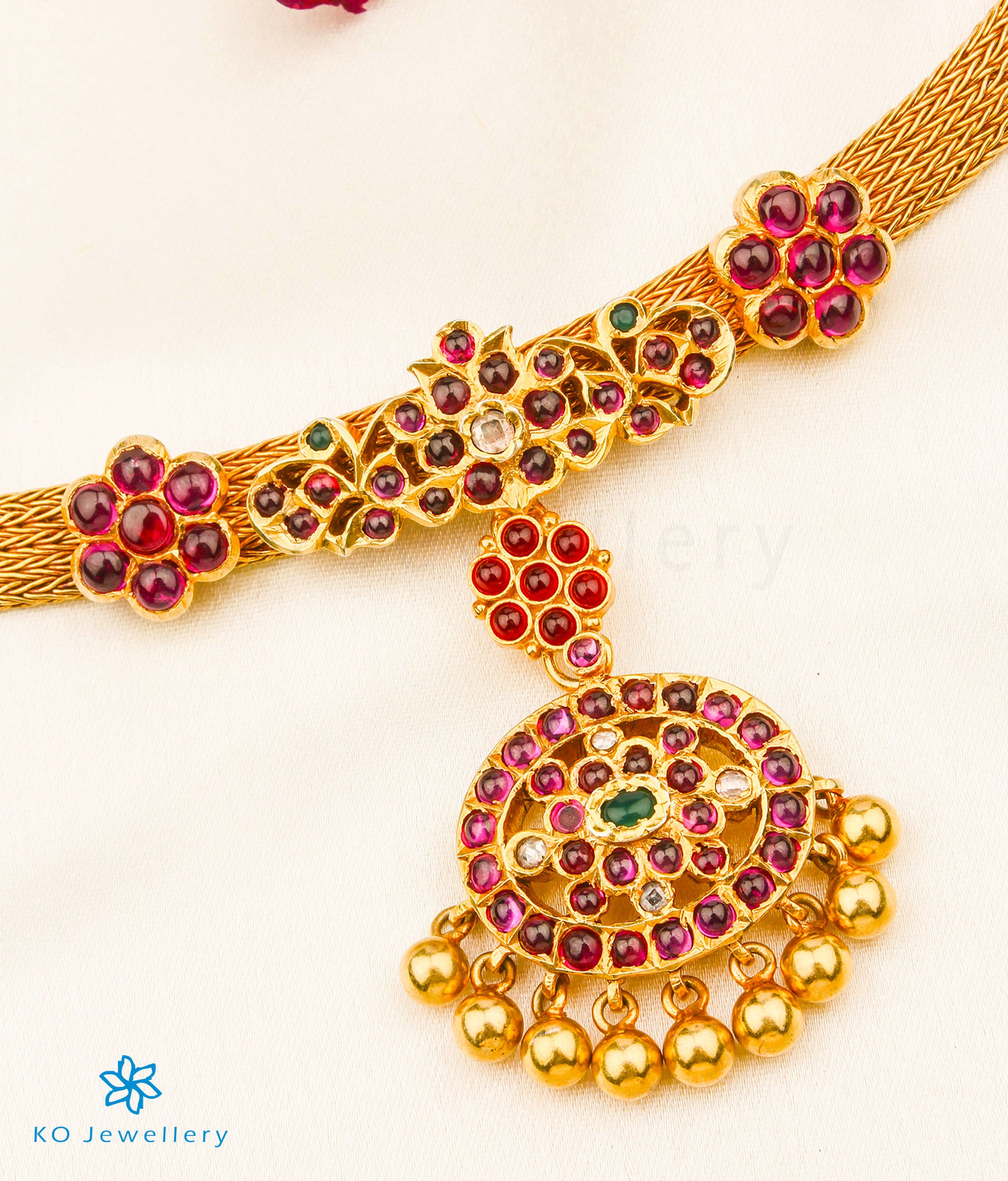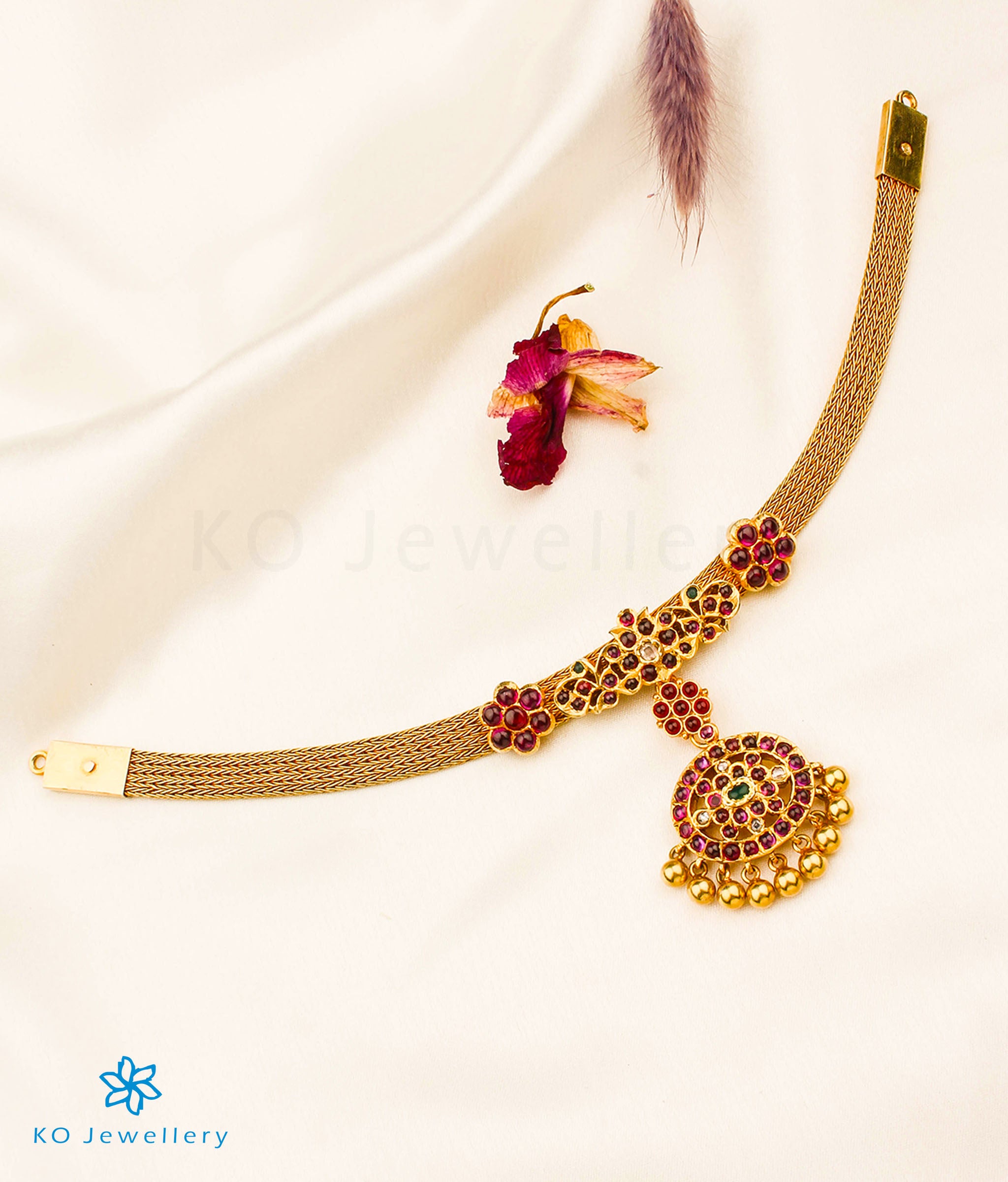 Flaunt a centuries old classic design of south Indian temple jewellery when you wear this choker-necklace with a kemp pendant attached to a flat silver chain. Called an `Addige' in Kannada or ‘Addigai’ in Tamil , this necklace is crafted in Sterling Silver (92.5%) using techniques used in ancient South Indian antique gold temple jewellery and gold-dipped to perfection.